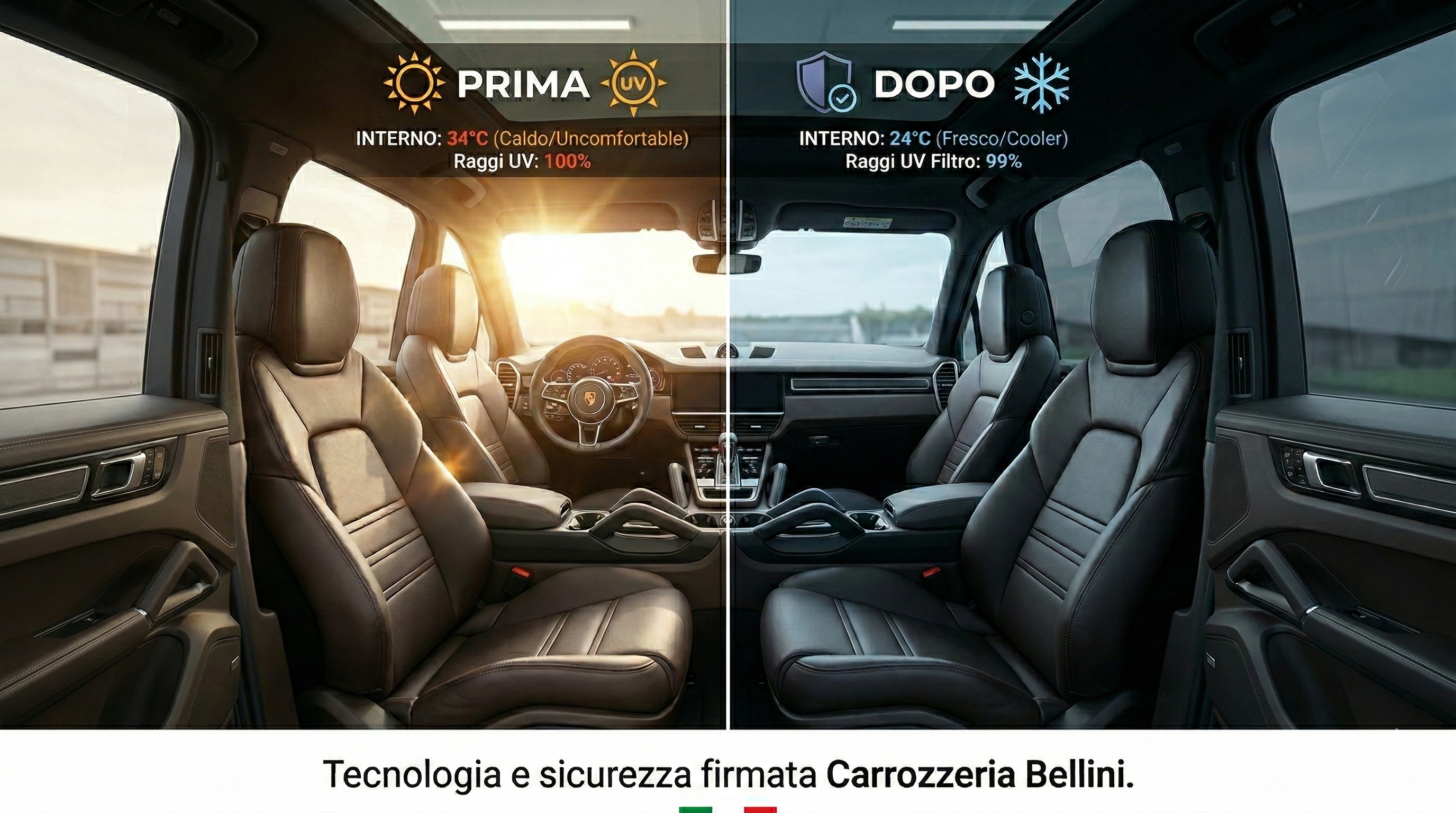 Da Carrozzeria Bellini la qualità dell’applicazione è garantita: operiamo senza smontare i pannelli porta e assicuriamo una finitura priva di bolle o imperfezioni. Essendo un centro autorizzato, applichiamo solo pellicole conformi alle direttive europee sui soli vetri laterali posteriori e sul lunotto. Al termine dell’installazione, rilasciamo il certificato di omologazione e applichiamo i marchi identificativi previsti dalla legge, mettendoti al riparo da sanzioni e problemi in sede di revisione.
